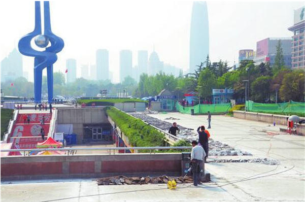 近,在泉城广场中部,工人们正在剔除地面石砖,对下沉广场地面进行改造。据了解,该施工主要是剔除原来损坏的地砖,更换新的地砖。本次施工大约进行个多月时间,将在5月中旬完成。