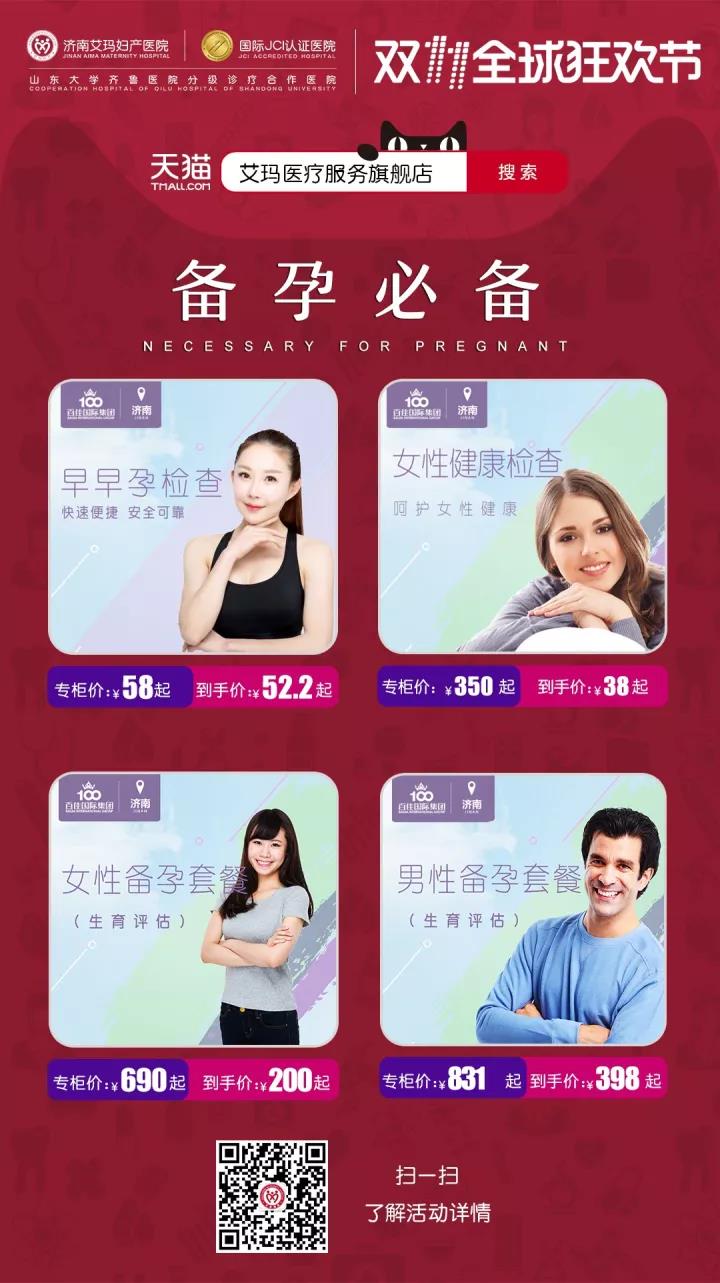 1 淘宝、天猫APP扫描下方二维码或搜索“艾玛医疗服务旗舰店”进入店铺,点击“济南院区”即可进入“济南艾玛妇产医院”查找所需的项目,提前添加至购物车。