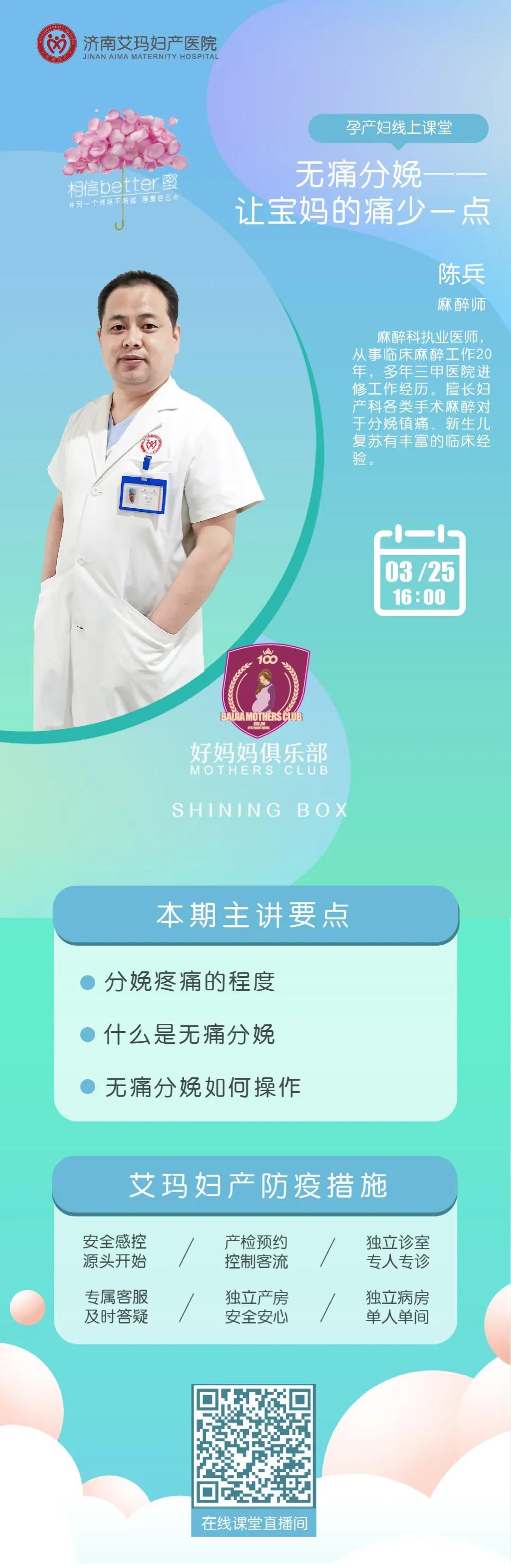 接下来的课程,我们邀请了麻醉科执业医师陈兵,给大家授课。陈兵从事临床麻醉工作20年,多年三甲医院进修,工作经历。擅长妇产科各类手术麻醉,对于分娩镇痛。新生儿复苏有丰富的临床经验。
